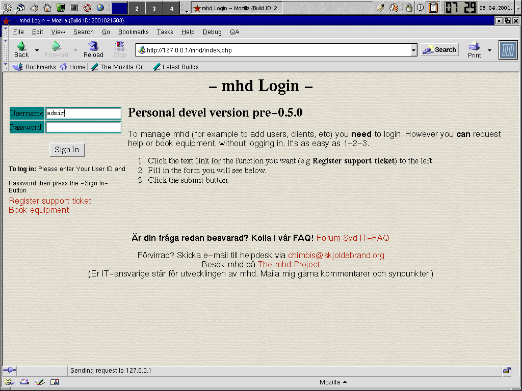 Much of the basic stuff I thought about has been completed. Lot's of bug fixes need to be applied though. Keith Schoenefeld (one of the authors of IRM) and I are talking about mergeing mhd and IRM into an excellent helpdesk system. If this actually happens I plan to back port things into mhd. So what is now mhd might be a low-end helpdesk and the new IRM/mhd a higher end helpdesk. Only the future will se what happens. There are some stuff that I still feel can be added to mhd. LDAP connectivity, XML-support, extended stock inventory, ticket escalation, SLA support etc etc.